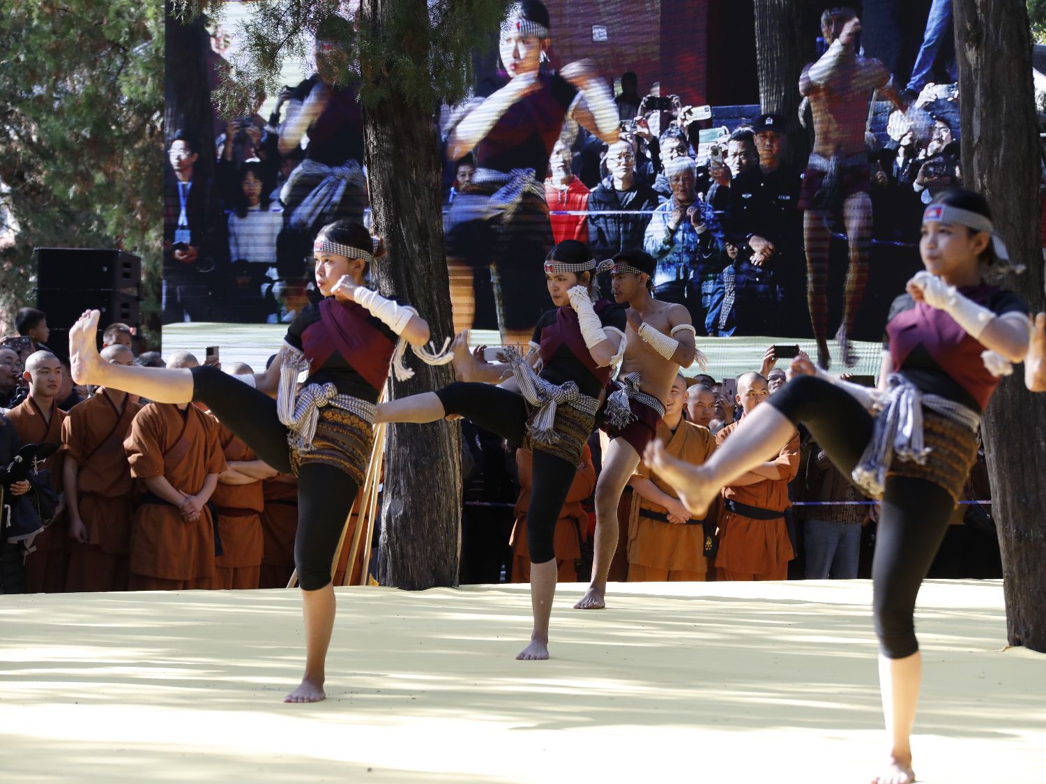 10月19日,“‘豫’‘柬’真功夫”功夫展演在河南郑州嵩山少林寺举行。此次展演系第十三届郑州国际少林武术节配套活动,通过少林功夫和柬埔寨高棉拳联合展演,深化中柬人文交流。图为柬方运动员展演功夫。中新社