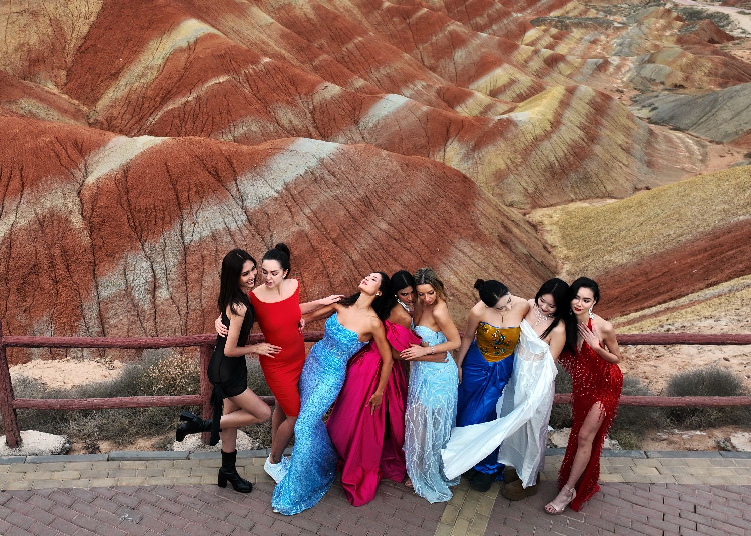 10月20日,2024丝路环球旅游小姐的参赛选手在甘肃张掖七彩丹霞采风拍摄。中新社