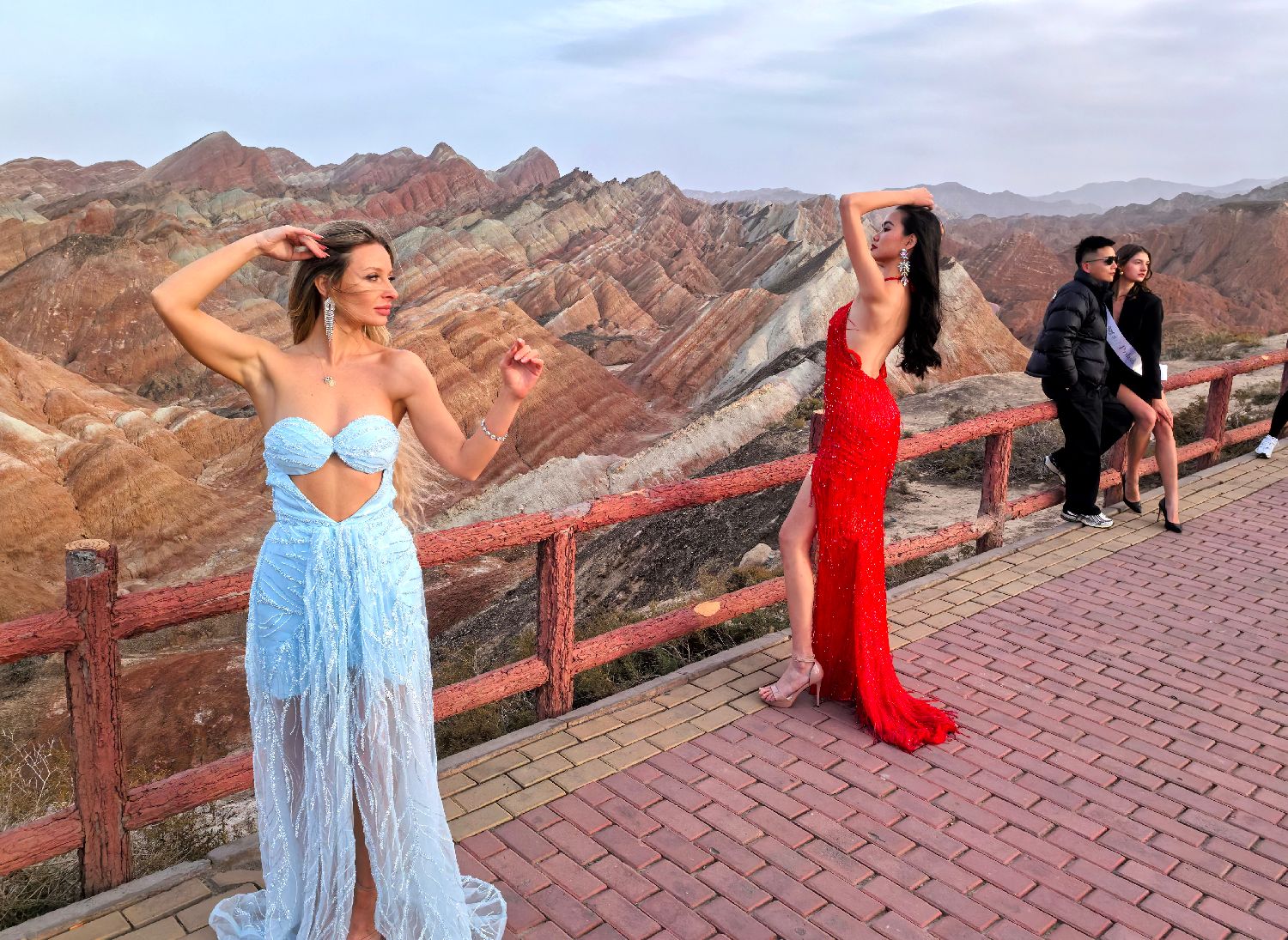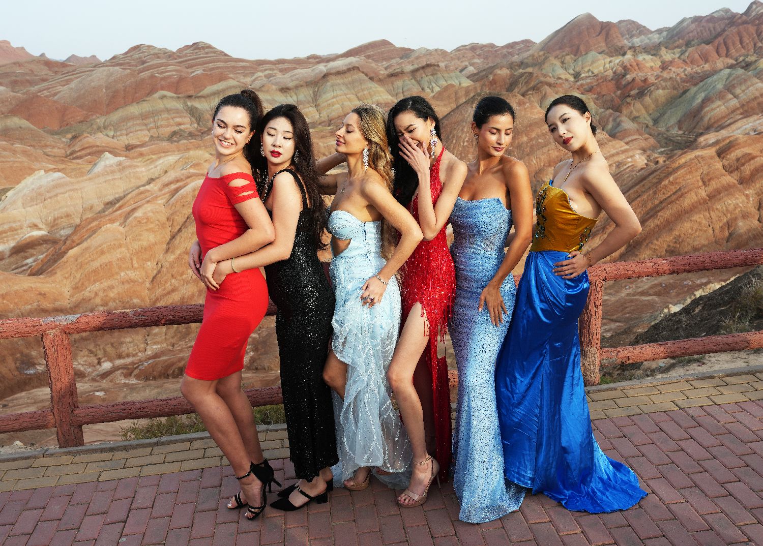 10月20日,2024丝路环球旅游小姐的参赛选手在甘肃张掖七彩丹霞采风拍摄。中新网