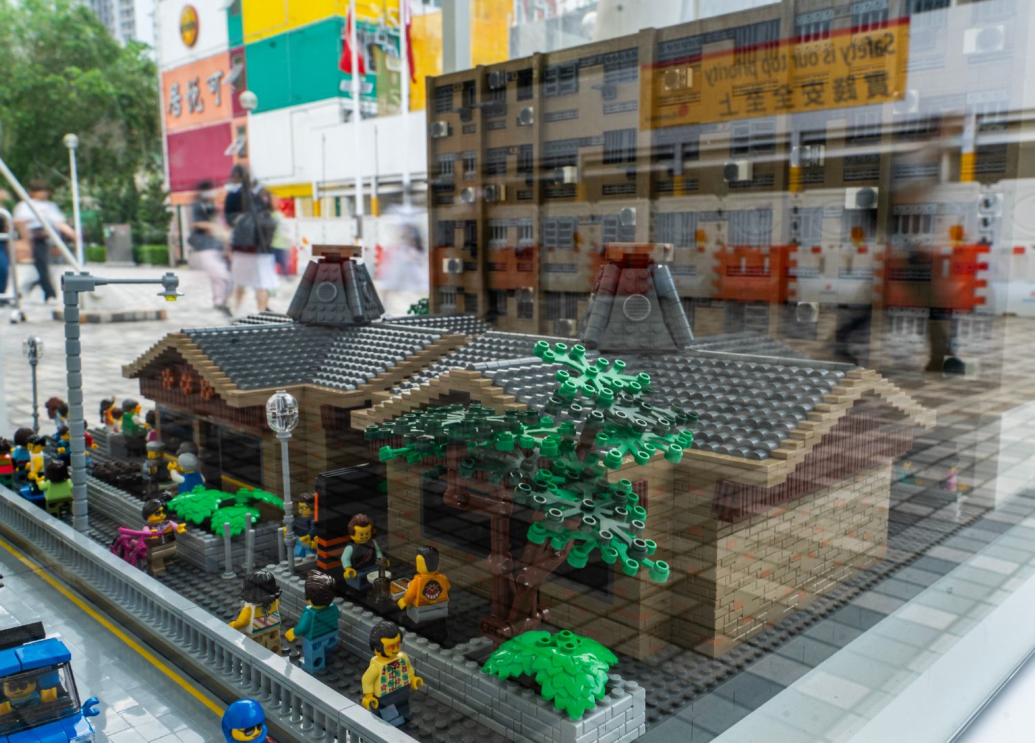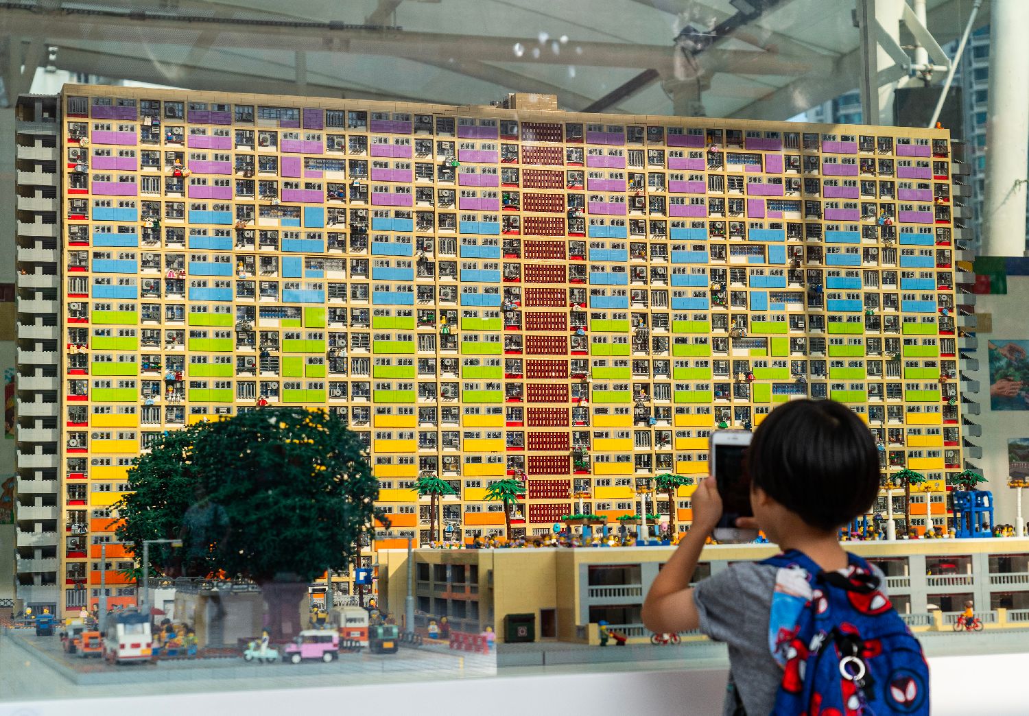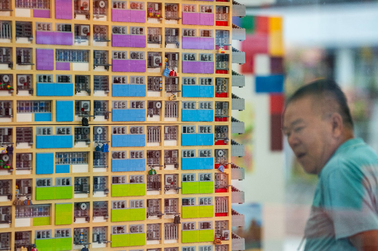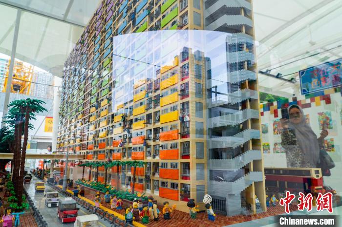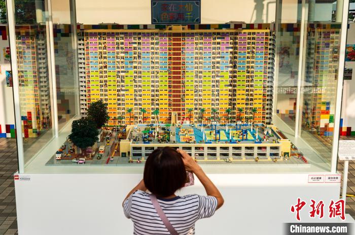 市民拍摄由乐高积木搭建的“彩虹邨”公共住宅模型。中新网