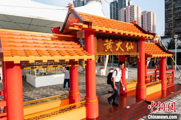 一名学生穿行一部分由乐高积木搭建而成的仿黄大仙祠门庭模型。中新网