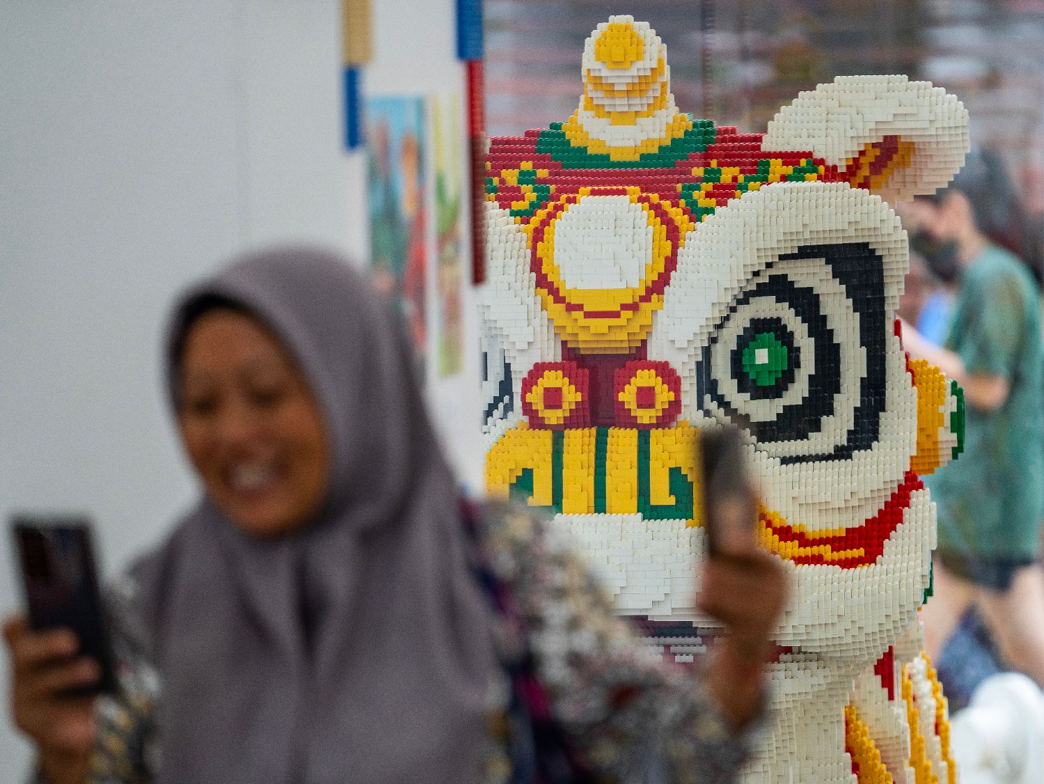 用乐高积木搭建的“醒狮”吸引市民拍照。中新社