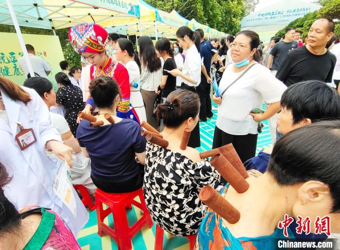 10月22日,在广西东兴市中越人民友谊公园,民众在体验壮医药物竹罐疗法。中新网