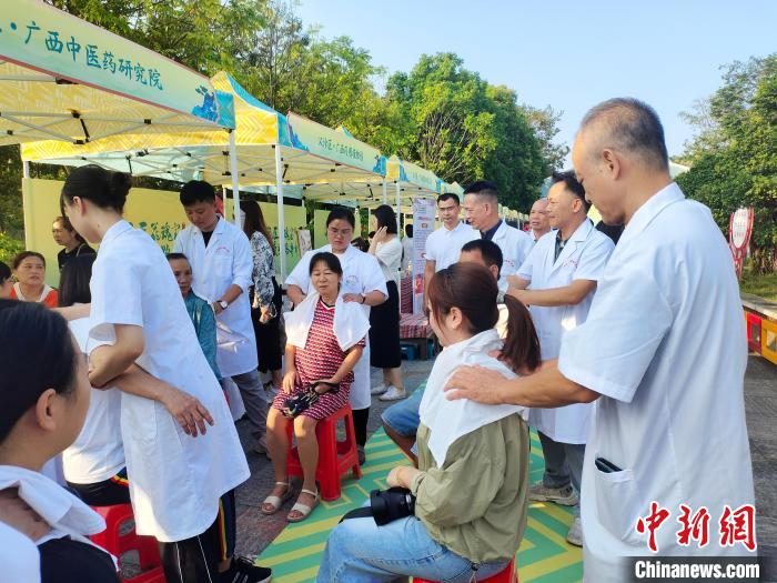 10月22日,在广西东兴市中越人民友谊公园,民众在体验推拿。中新网