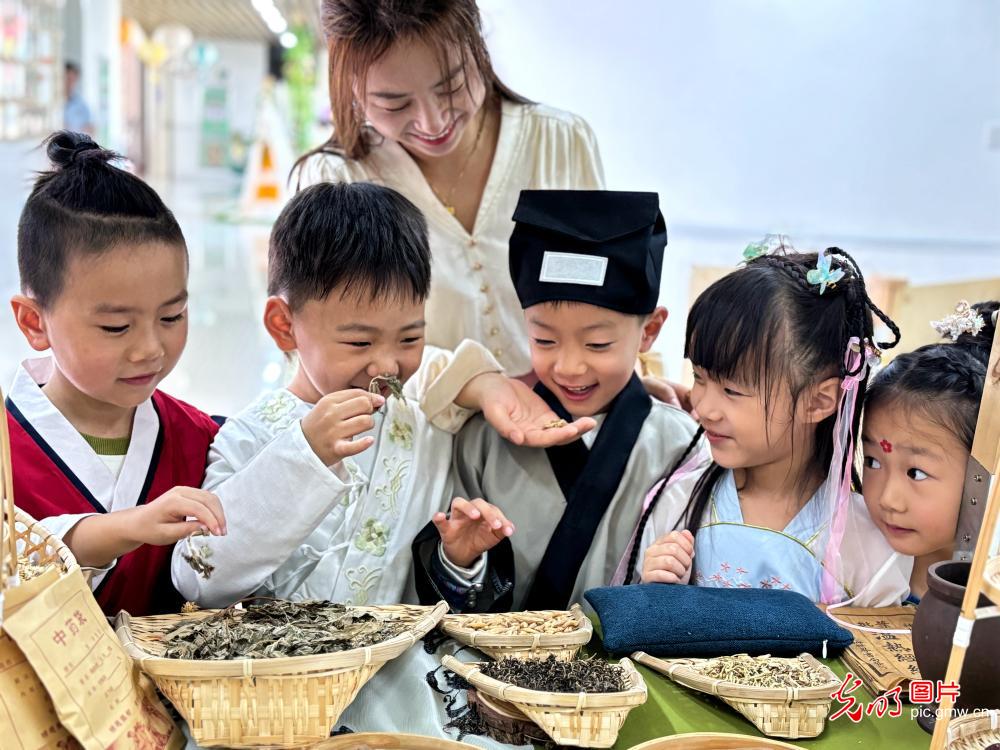 10月18日,安徽合肥市荷塘家园幼儿园,小朋友在老师的指导下认识常见中草药。光明网