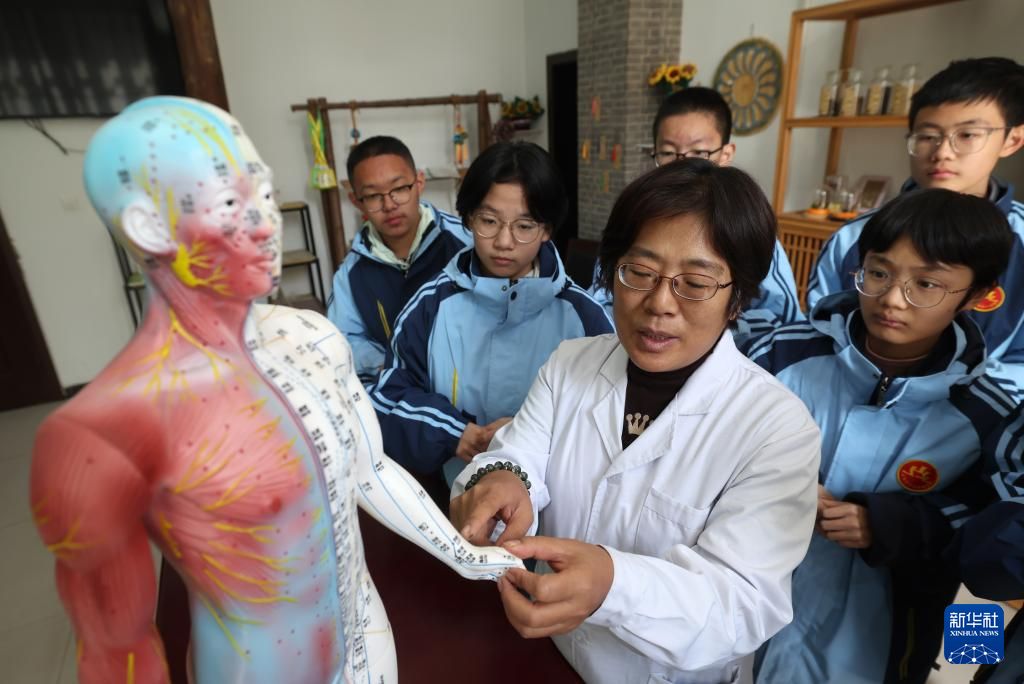 10月22日,在河北石家庄市第十中学中医课堂,中医老师为学生们讲解人体穴位及按摩功效。新华社