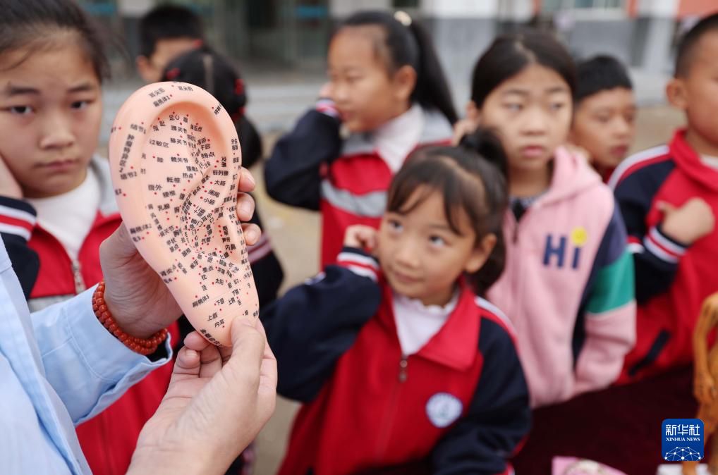 10月22日,在山东临沂市沂南县辛集镇中心小学,沂南县人民医院中医科的医生给孩子们讲解耳部穴位知识。新华社