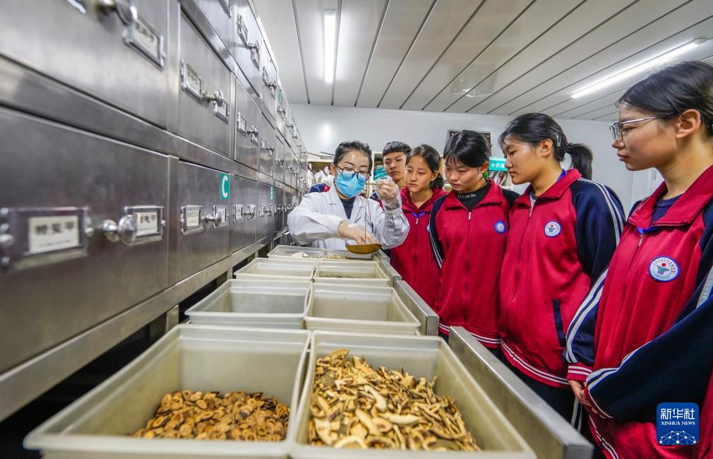 10月22日,中医师在药房向河北遵化市高级中学学生介绍中草药称重方法。新华社