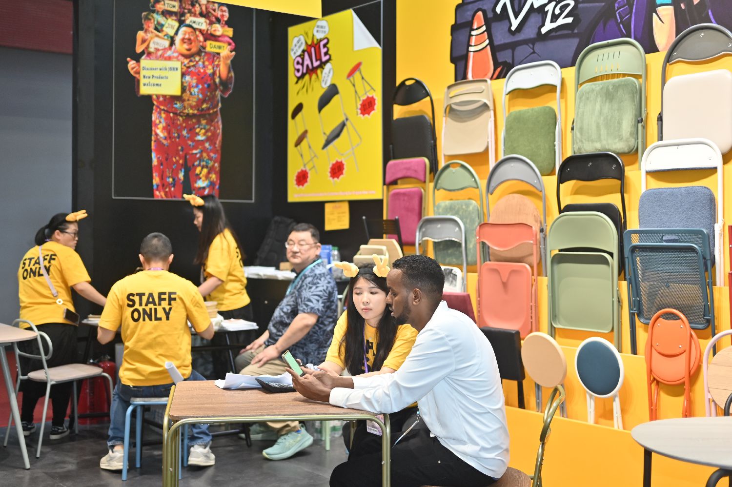 10月23日,一桌椅展位吸引采购商咨询洽谈。中新社