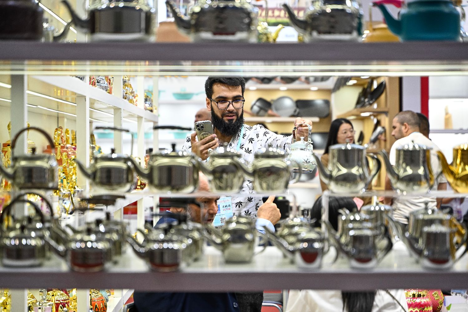 10月23日,采购商在餐厨用具展区挑选产品。中新社