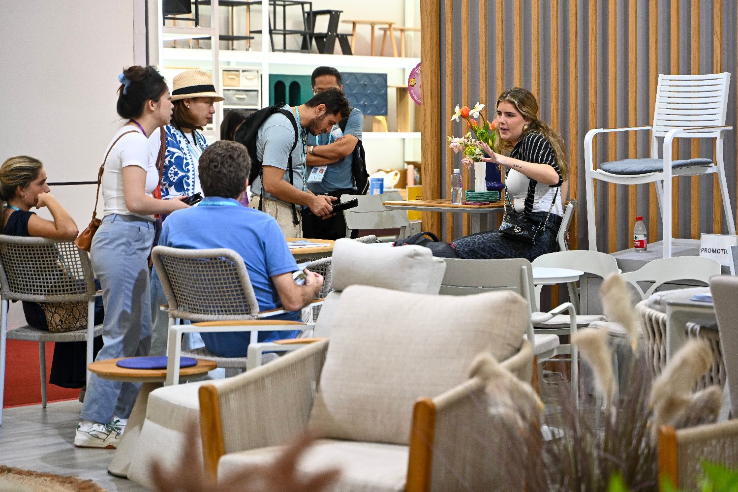 10月23日,参展商与采购商在室内家具展区内洽谈。中新社