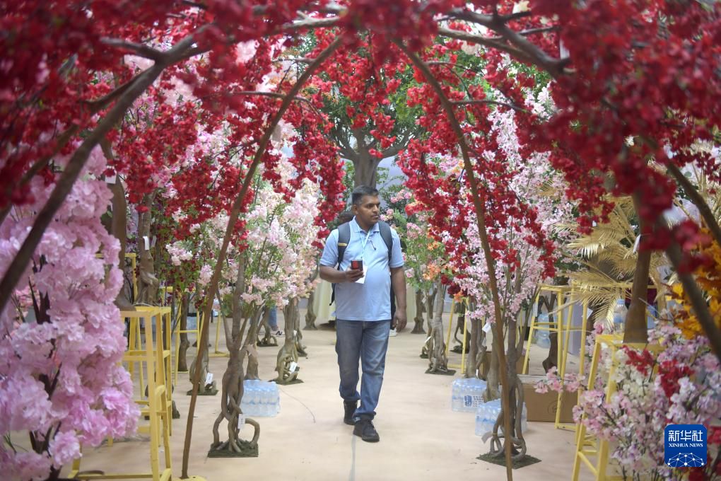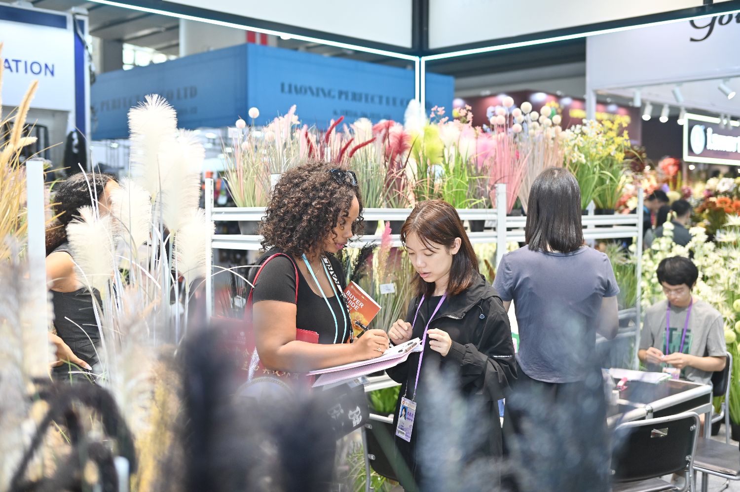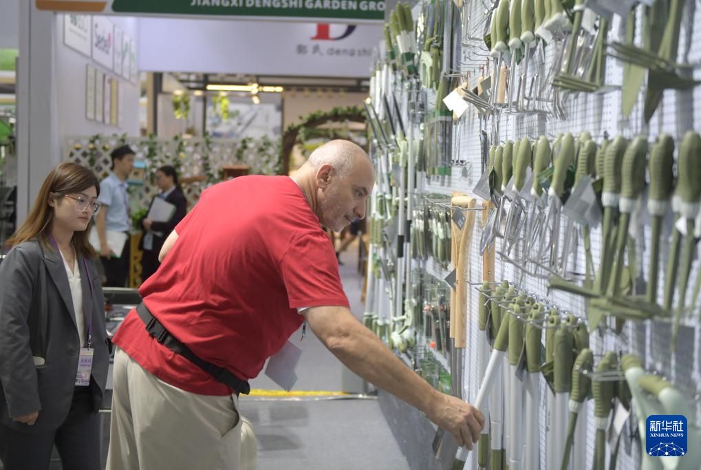10月23日,园林用品展区吸引采购商(左)咨询洽谈。中新社