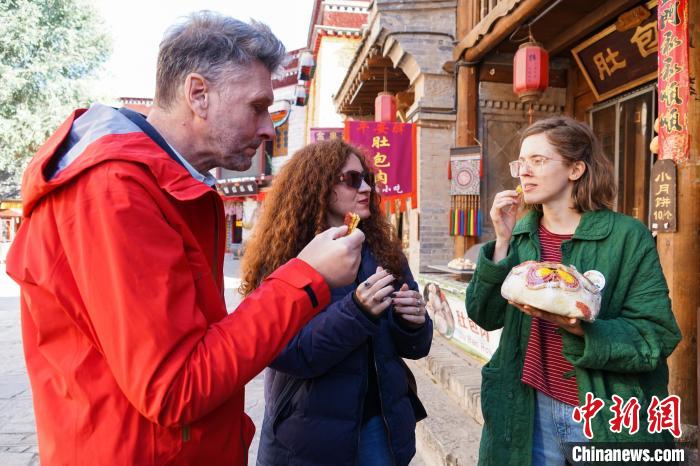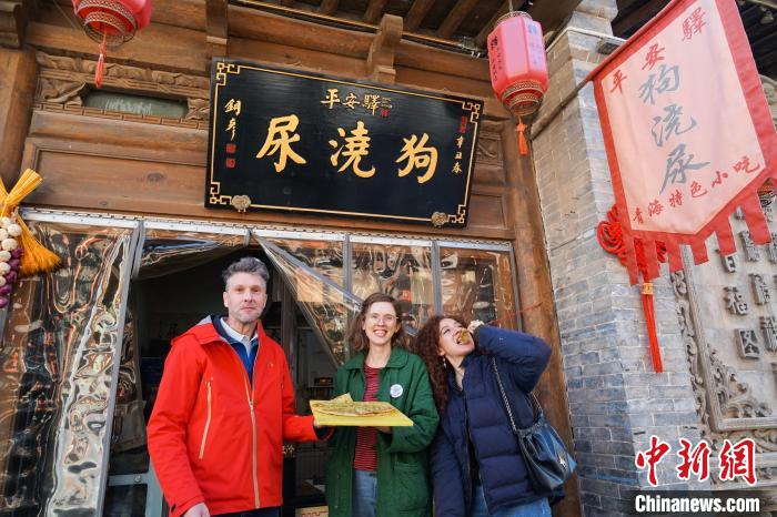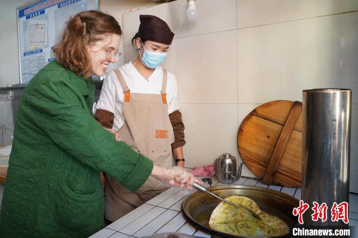 10月24日,“歪果仁”带你游青海第三季在青海省海东市平安驿·河湟民俗文化体验地启动。海外嘉宾漫步古街,品尝青海传统大月饼、罐罐茶,制作青海特色小吃“狗浇尿”饼,体验河湟地区民族特色饮食文化。平安驿历史上是唐蕃古道、古丝绸之路上的重要驿站,如今已建成集中传承展示河湟传统技艺与地域文化的中国国家级旅游度假休闲景区。图为海外嘉宾(左)体验制作“狗浇尿”饼。