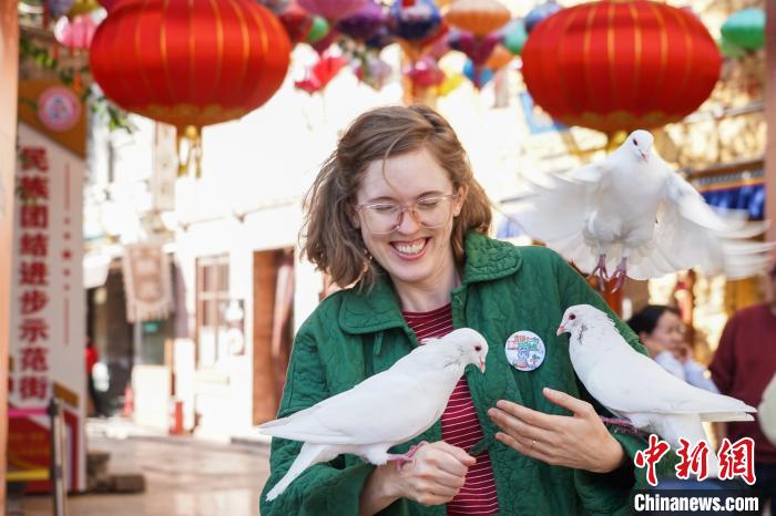 海外嘉宾在景区内与鸽子互动。