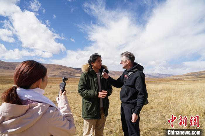 10月26日,“歪果仁”带你游青海第三季嘉宾(右)和翻译人员(中)在青海隆宝滩国际重要湿地内拍摄视频。中新网