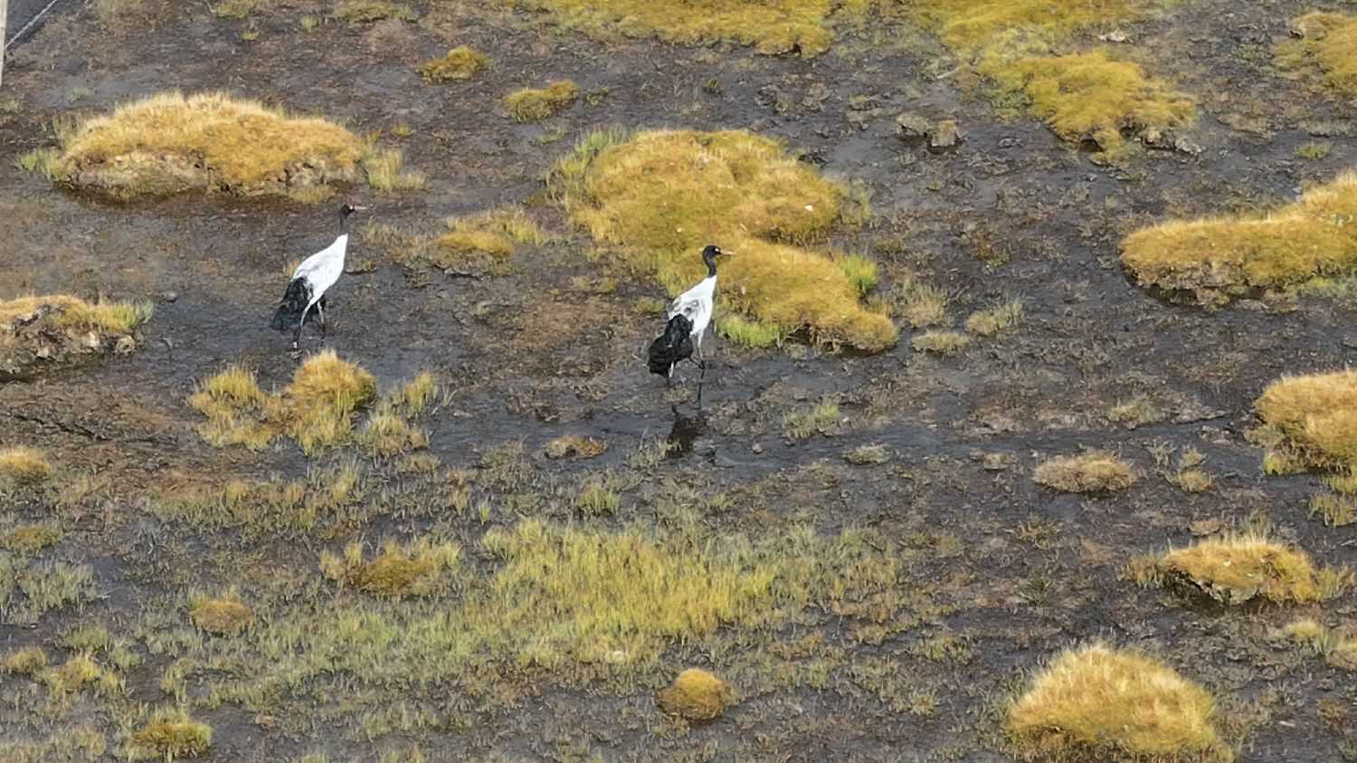 10月26日,“歪果仁”带你游青海第三季嘉宾赴“黑颈鹤之乡”青海隆宝滩国际重要湿地拍摄创作,了解黑颈鹤繁衍栖息及湿地保护知识。青海隆宝滩国际重要湿地位于青海省玉树藏族自治州玉树市境内,优美的生态环境和中国珍稀鸟类黑颈鹤理想栖息繁殖地而闻名,被誉为“黑颈鹤之乡”。图为两只黑颈鹤在青海隆宝滩国际重要湿地内漫步。中新社