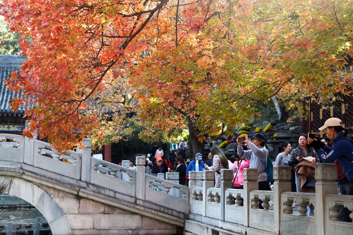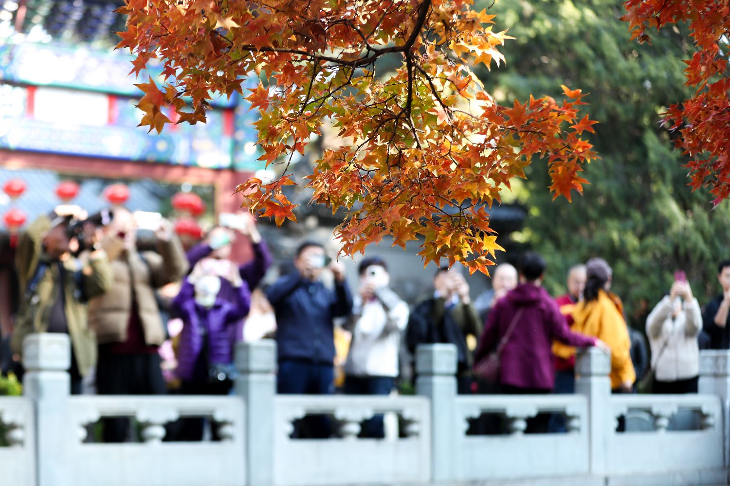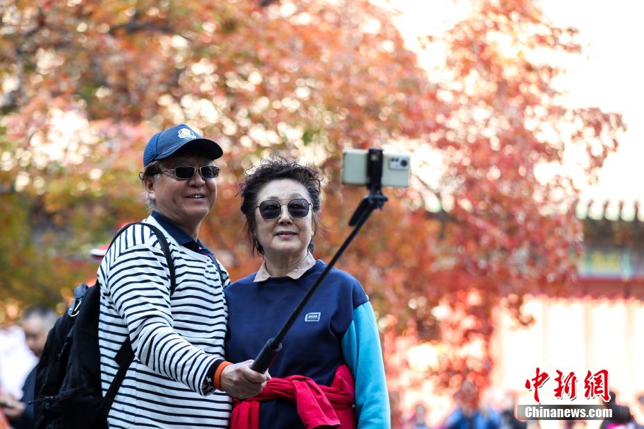 近日,香山公园进入彩叶最佳观赏期,赏叶的游客纷至沓来。图为10月28日,北京香山公园勤政殿,红枫吸引游客。中新社