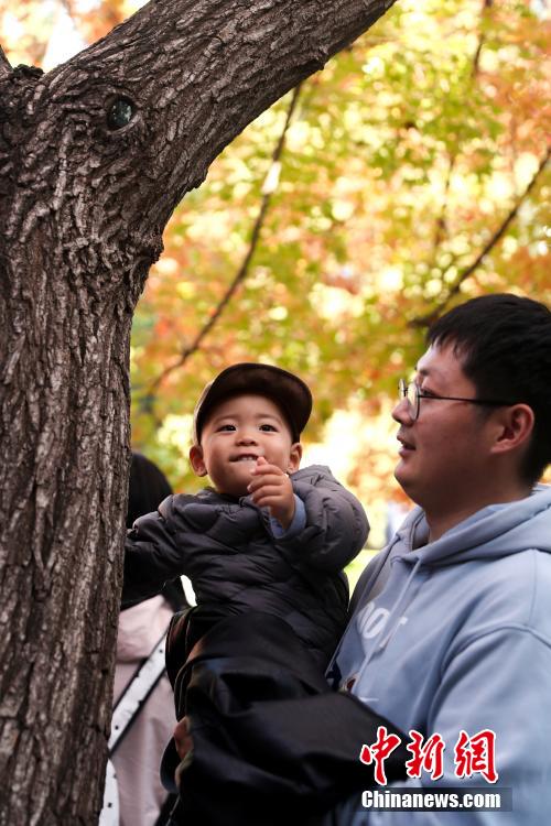 10月28日,游客带着孩子观赏香山公园的红叶。中新网