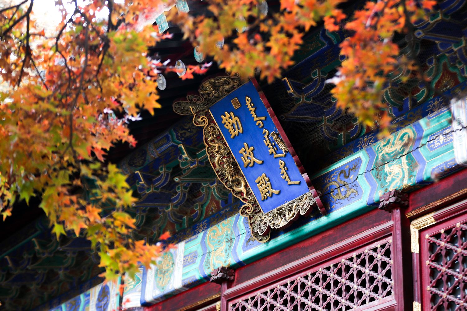 10月28日,北京香山公园勤政殿与红枫同框。中新社