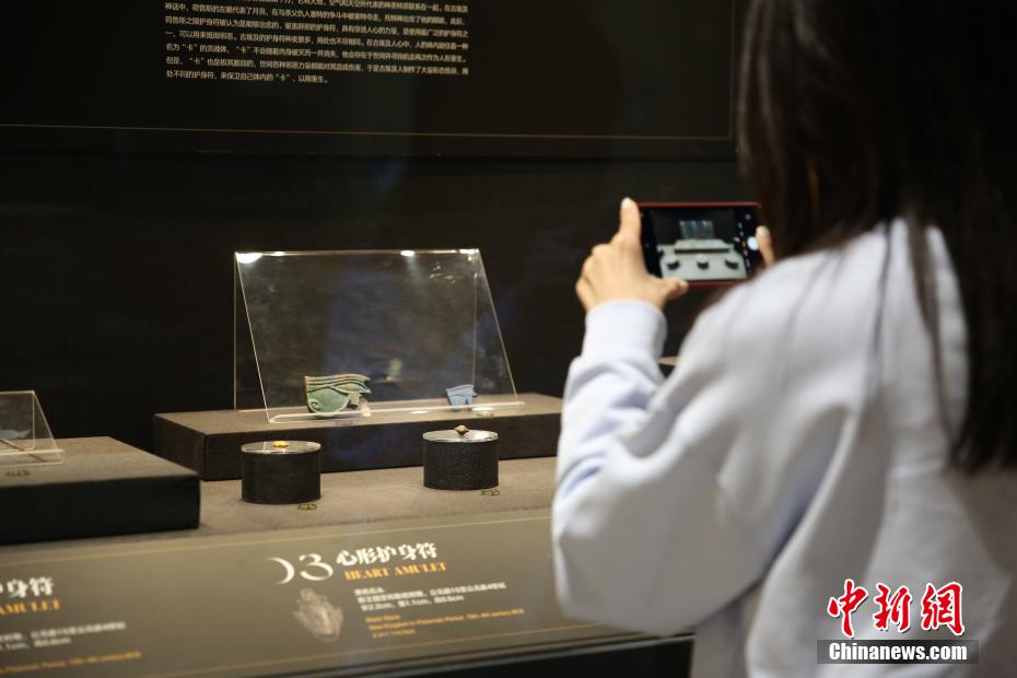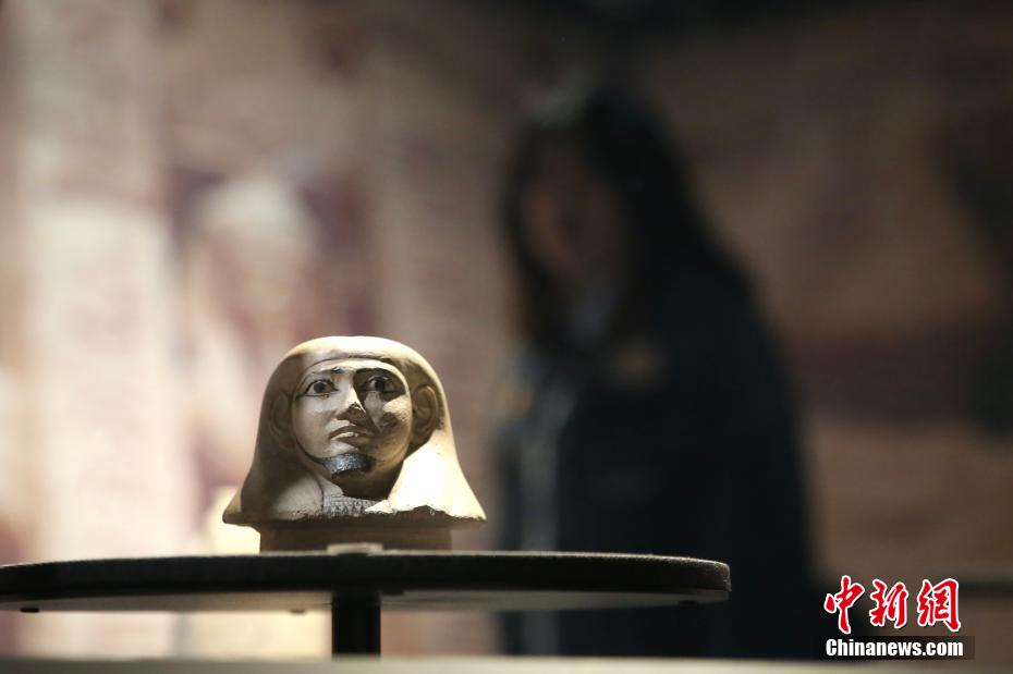 观众观看展出的卡诺匹斯罐盖,卡诺匹斯罐用于盛放木乃伊内脏。中新网