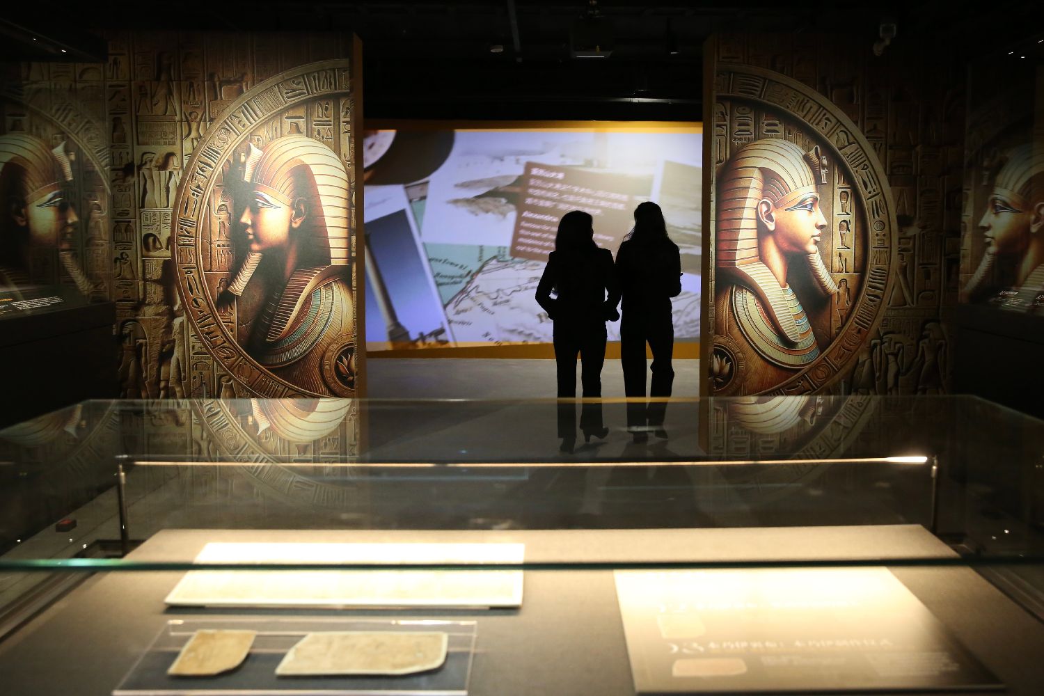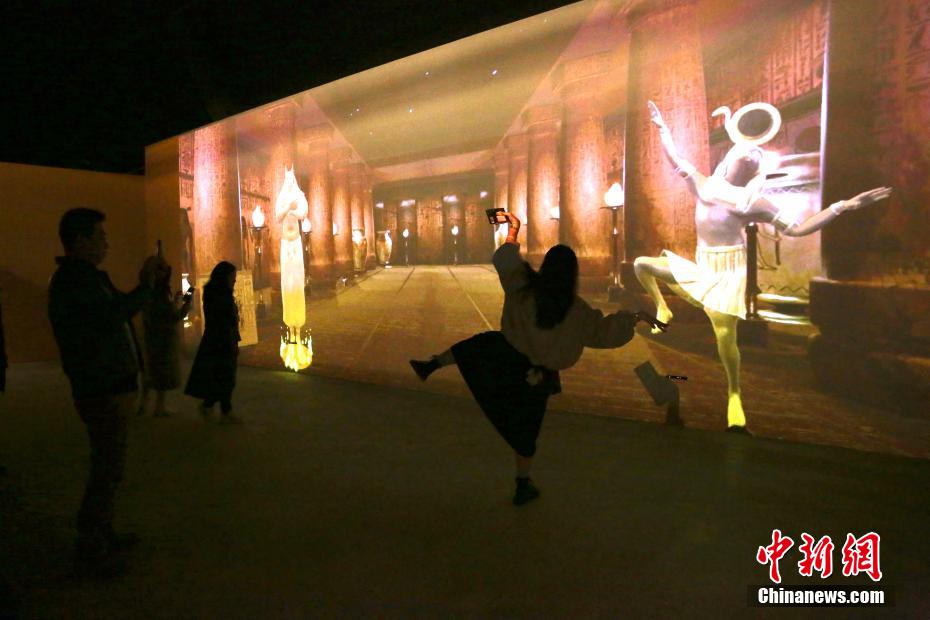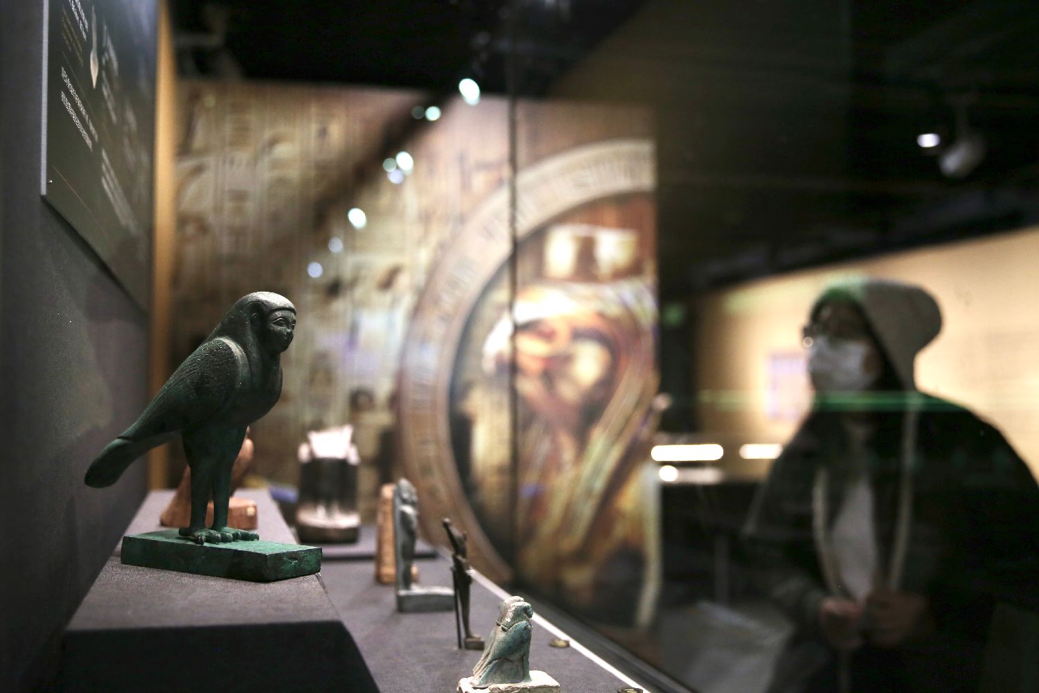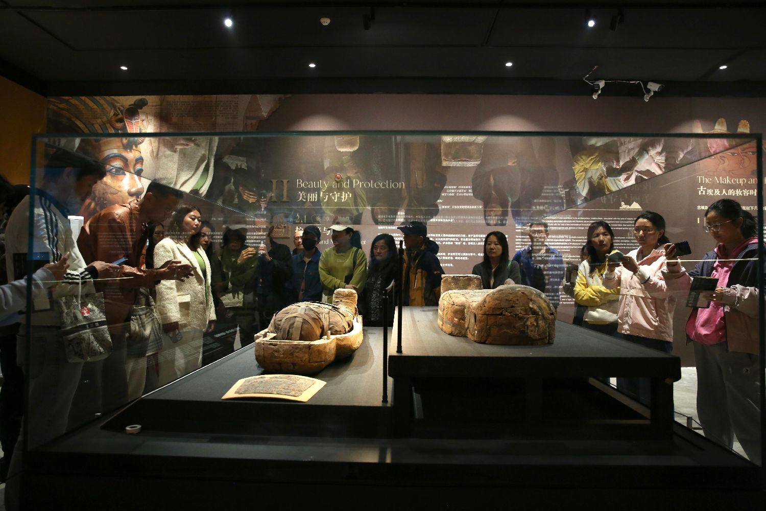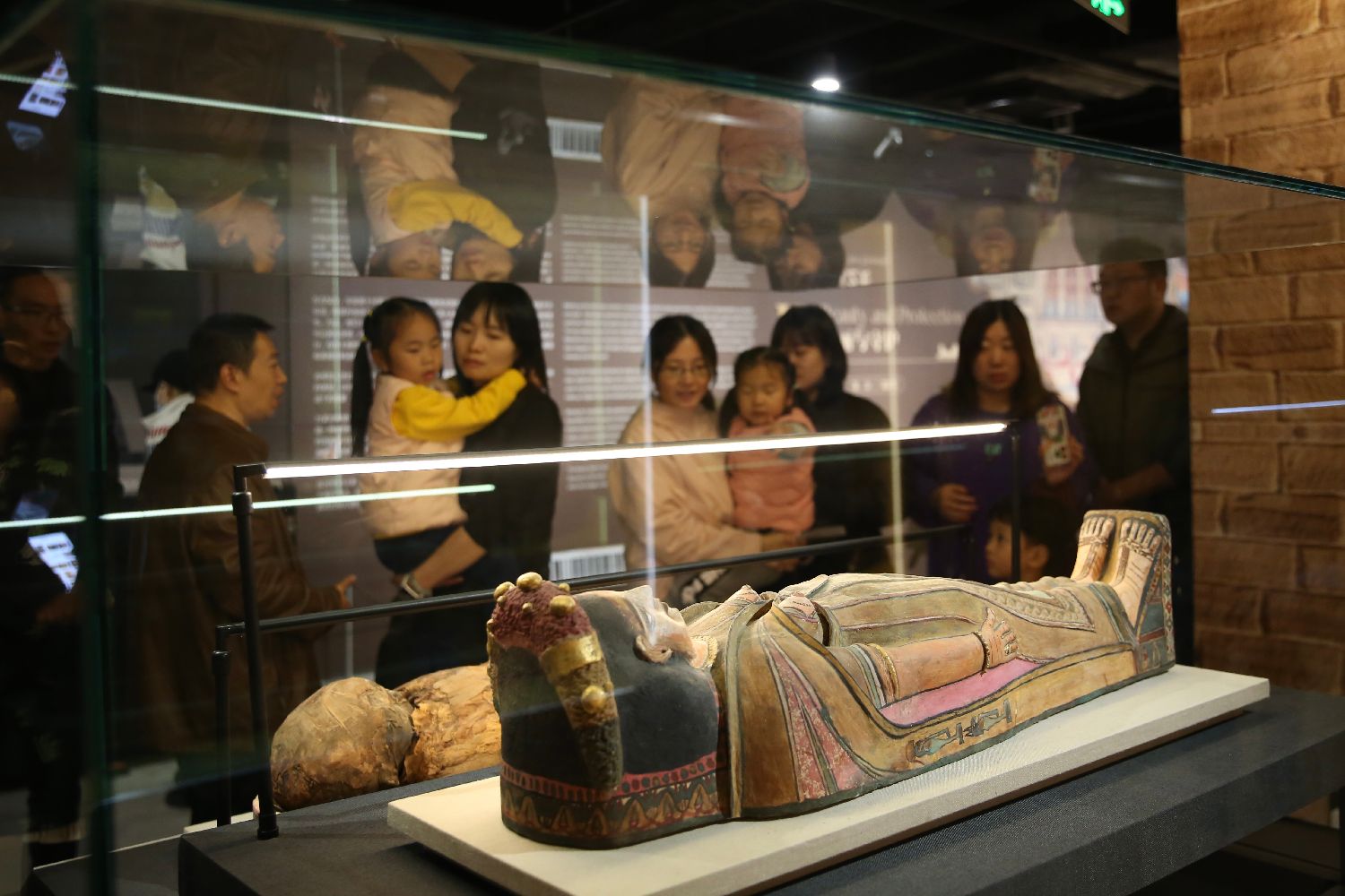 10月31日,“遇见古埃及:永恒的木乃伊之谜”文物展举行提前探展。该展览于11月1日在遇见博物馆·北京798馆正式开展。据悉,本次展览共展出123件(组)古埃及珍贵文物,跨越4300年历史,历经32个王朝变迁。图为观众观看展出的3岁小女孩的木乃伊及其棺椁。中新社