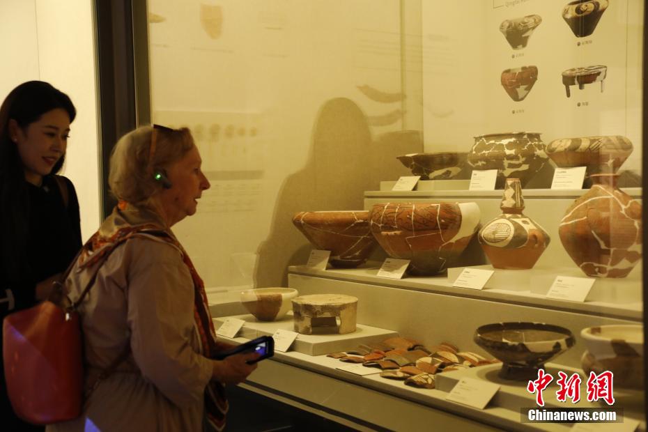外籍专家学者在郑州市文物考古研究院考古博物馆参观陶器。中新网