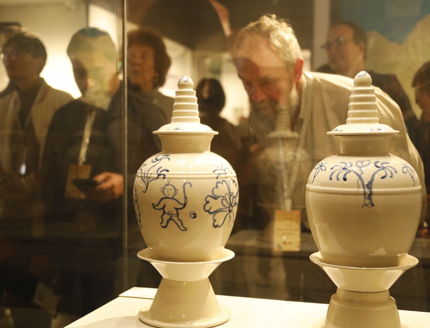 11月3日,“世界古典学大会·走读中国之中原行”活动在河南郑州启动,来自13个国家的40余位外籍古典学专家学者开启“商都”之旅。图为外籍专家学者在郑州市文物考古研究院考古博物馆参观塔式青花瓷罐。中新社