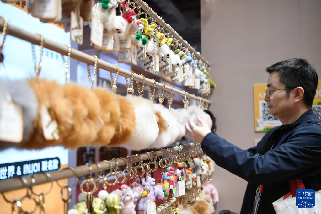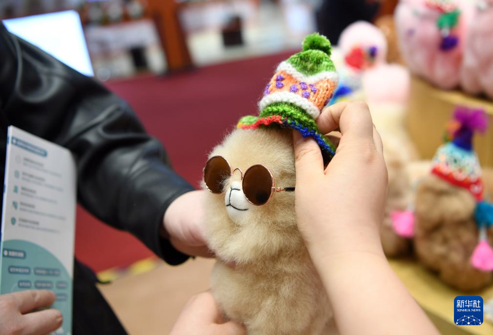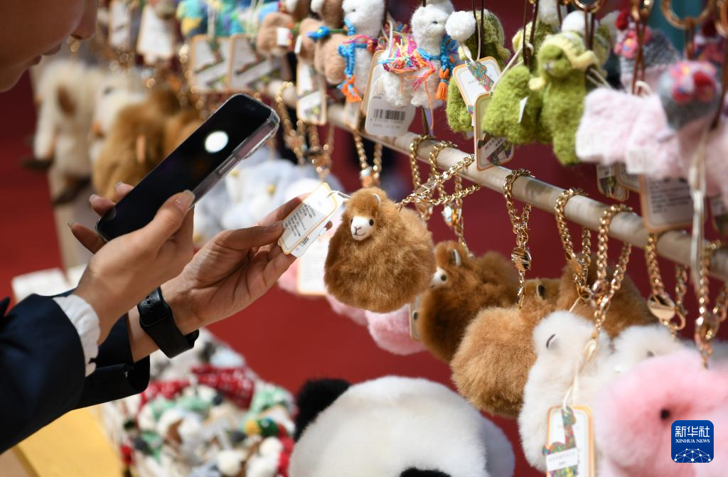 2016年,中国姑娘马玉霞在秘鲁阿雷基帕街边市场购买了秘鲁羊驼毛制品手工艺人奥斯瓦尔多·马马尼的羊驼毛玩偶并引入中国市场。通过连续参展进博会,羊驼毛制品在中国市场大受欢迎,并创立了中文品牌“温暖驼”。 今年,秘鲁品牌“温暖驼”连续第七年亮相中国国际进口博览会(下称进博会),受到更多中国消费者的喜爱。目前,“温暖驼”品牌已入驻中国30多家商场,并且开拓了电商平台线上销售,年销量超过3万只。 图为11月5日,一名男子在上海的第七届进博会秘鲁“温暖驼”展台选购羊驼玩偶。