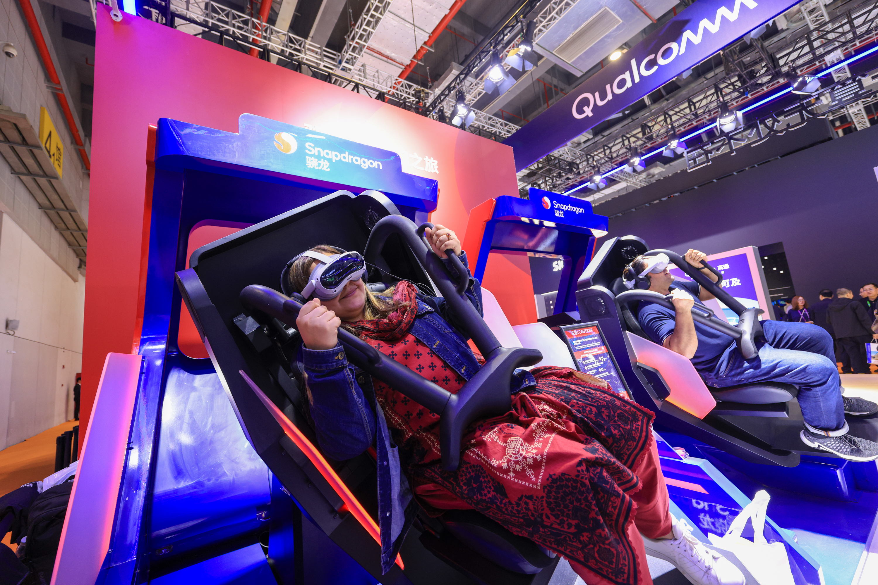 11月6日,在进博会技术装备展区内,观众在高通展区体验一款沉浸式VR游戏。中新社