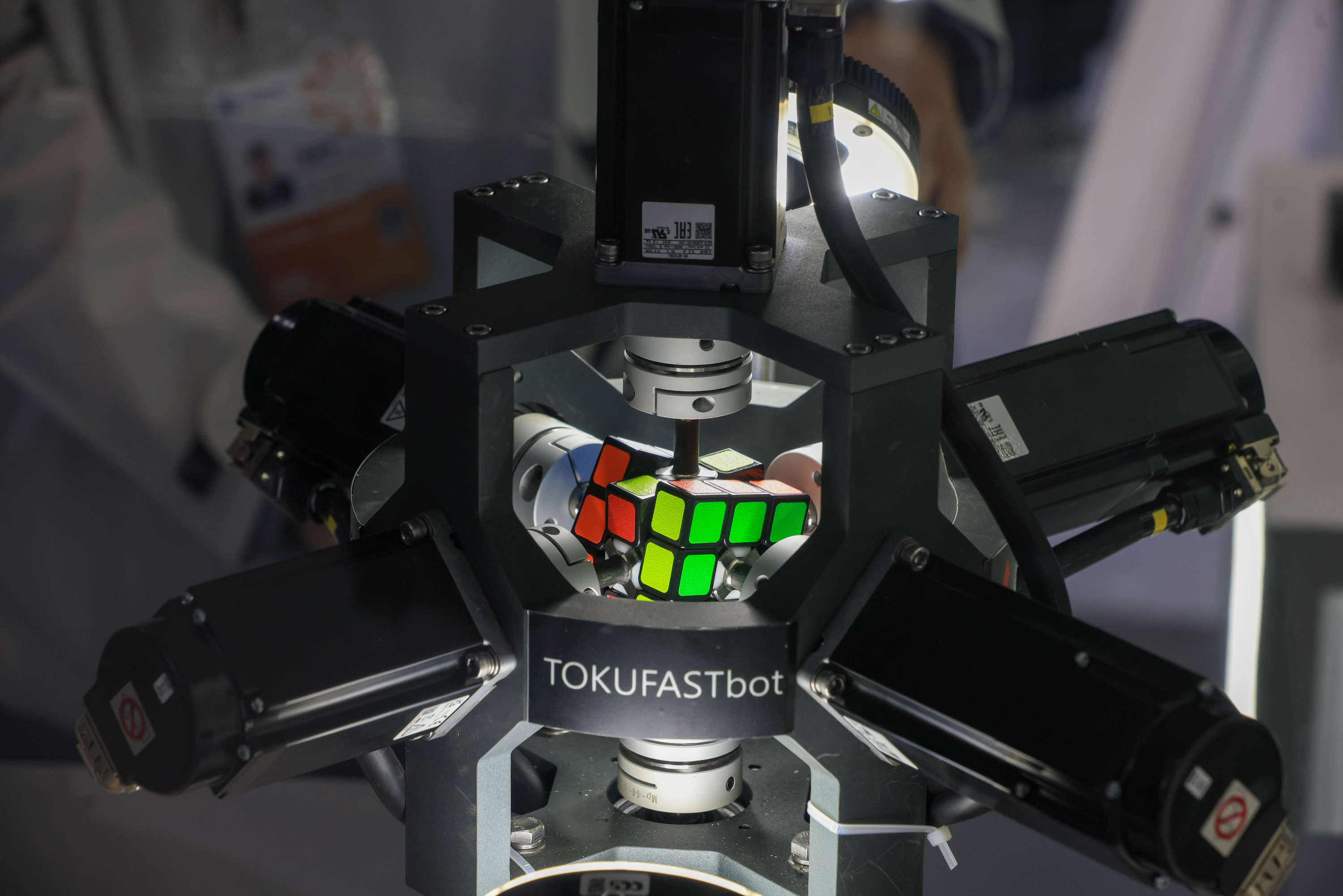 11月6日,在进博会技术装备展区内,机器人以极快速度复原打乱的魔方。中新社