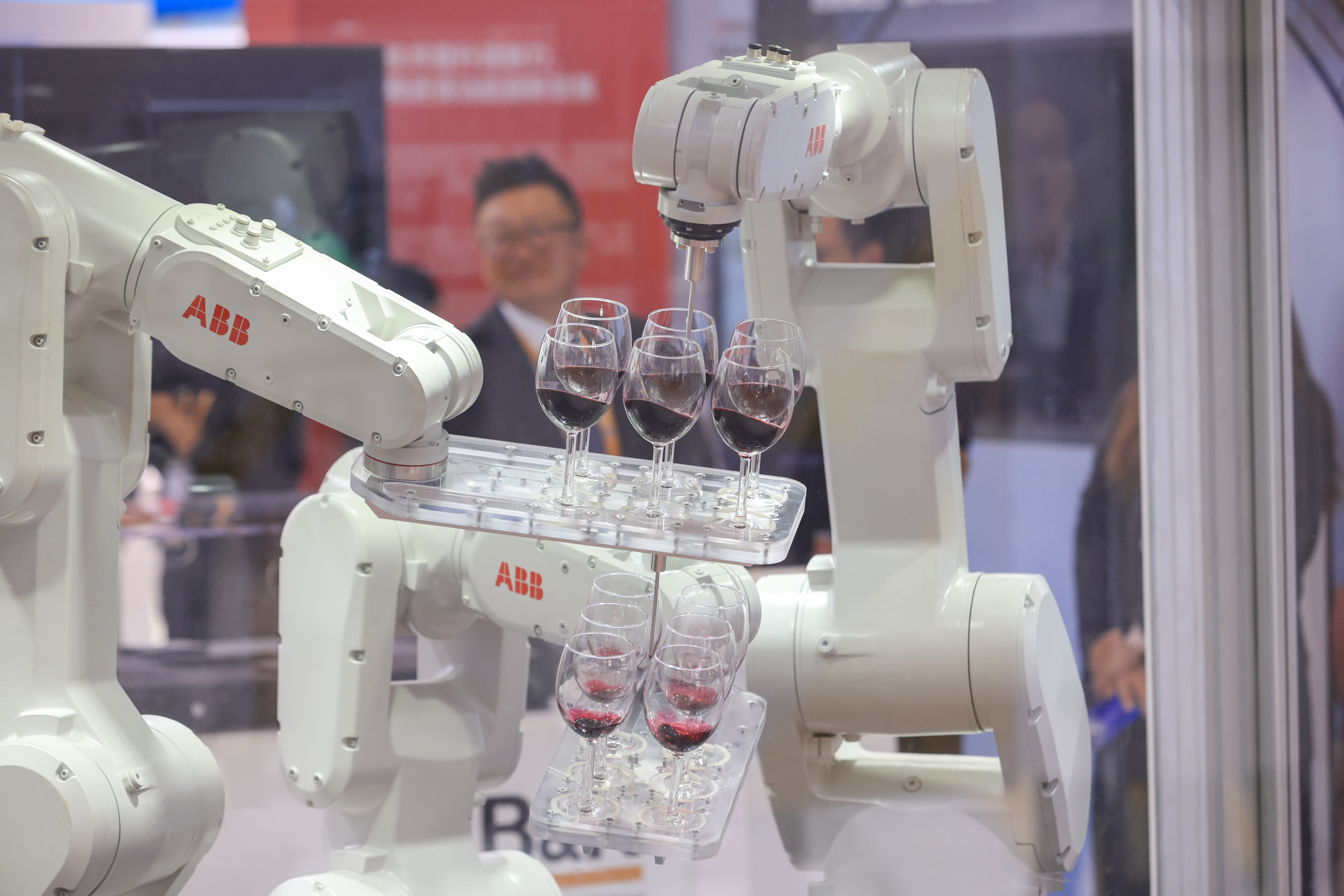 11月6日,在进博会技术装备展区内,一款机械臂在装有红酒的酒杯之间快速穿行而没有互相碰撞,展示了高精度的控制性。中新社