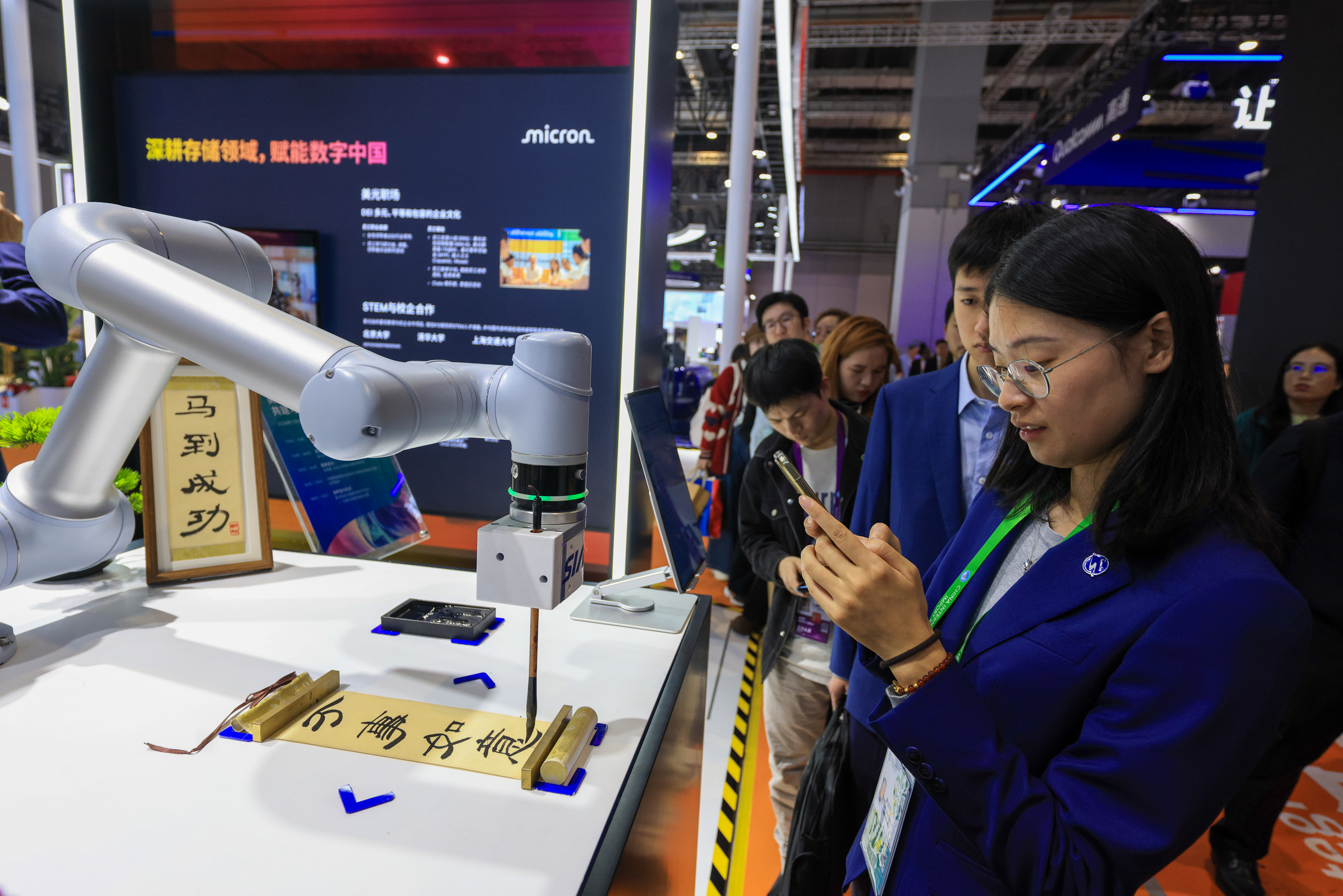 11月6日,在进博会技术装备展区内,观众参观机器人写毛笔字。中新社