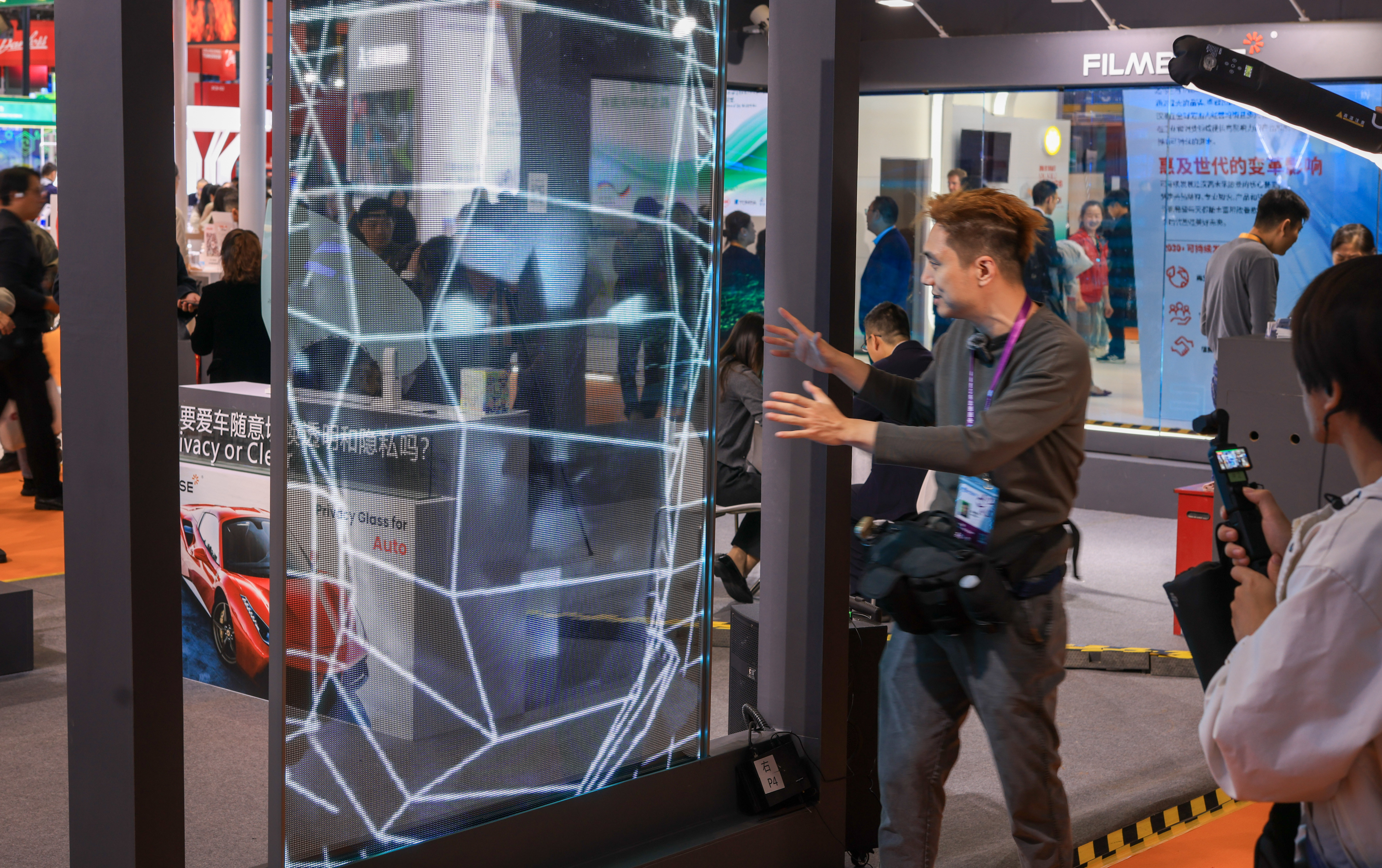 11月6日,在进博会技术装备展区内,御光公司展台的一款3D透明显示屏吸引观众。中新社