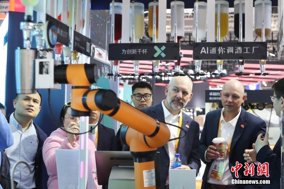 11月7日,进博会技术装备展区西门子展台拍摄的AI迷你调酒工厂吸引观众。中新网