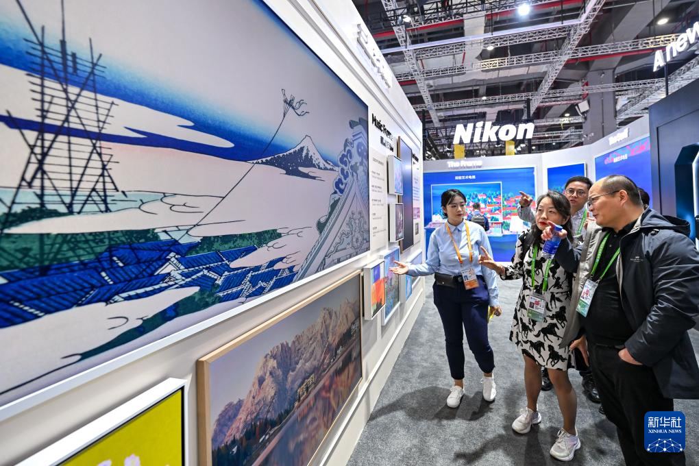 11月6日,观众在进博会技术装备展区三星展台体验一款画壁艺术音响。新华社