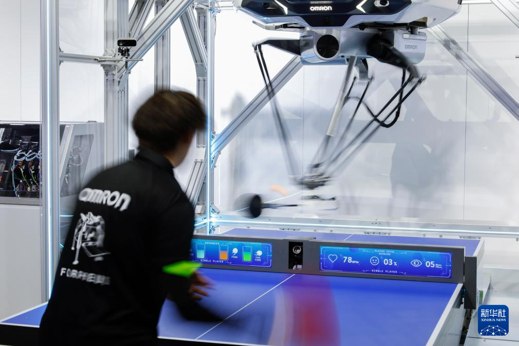 11月6日,在进博会技术装备展区,工作人员在与欧姆龙乒乓球教练机器人互动中回球。新华社