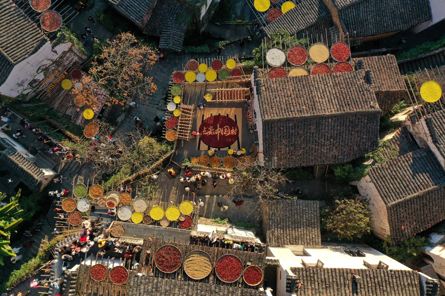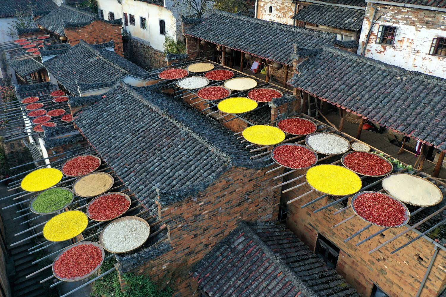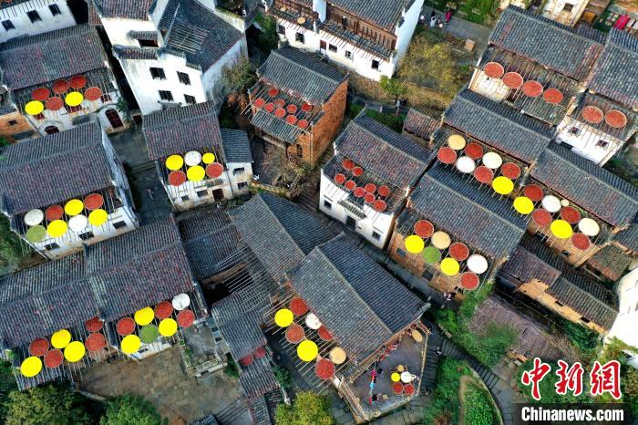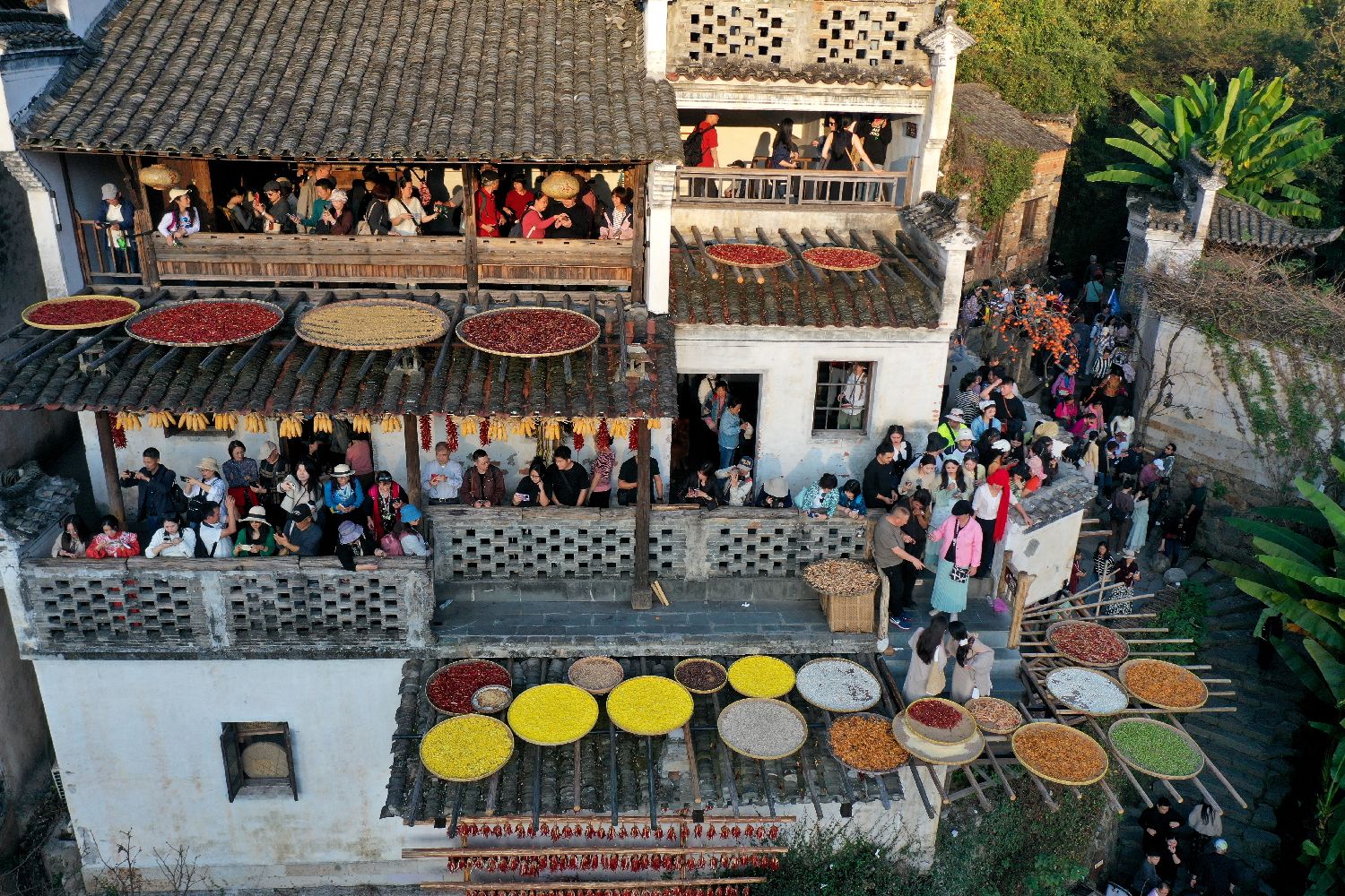 篁岭古村村位于江西省婺源县东北部,数百栋徽派古民居在坡面错落排布,与晒架上的皇菊、辣椒、柿子等五彩缤纷的丰收成果组合,绘就出“晒秋”农俗特色景观。图为11月11日,江西婺源县篁岭古村的“晒秋”农俗景观。中新社