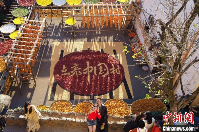 11月11日,游客在摆出“点亮中国村”字样的晒秋工坊前自拍留影。中新网