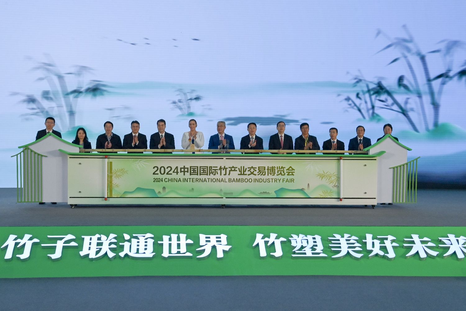 11月11日,以“竹子联通世界 竹塑美好未来”为主题的2024中国国际竹产业交易博览会在四川省眉山市青神县开幕,吸引了专家学者、协会商会、专业采购商等900余人参加,共谋竹产业发展。图为现场嘉宾共同启动竹博会。中新社