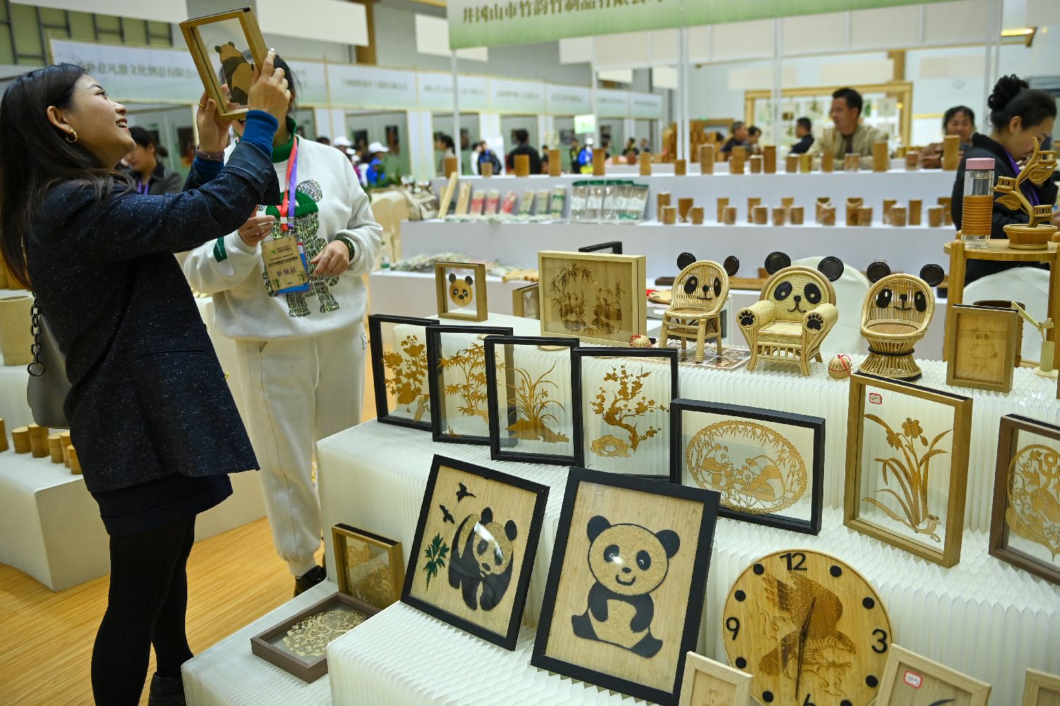 11月11日,竹子制作的“熊猫”等工艺品摆件等吸引参观者。中新社