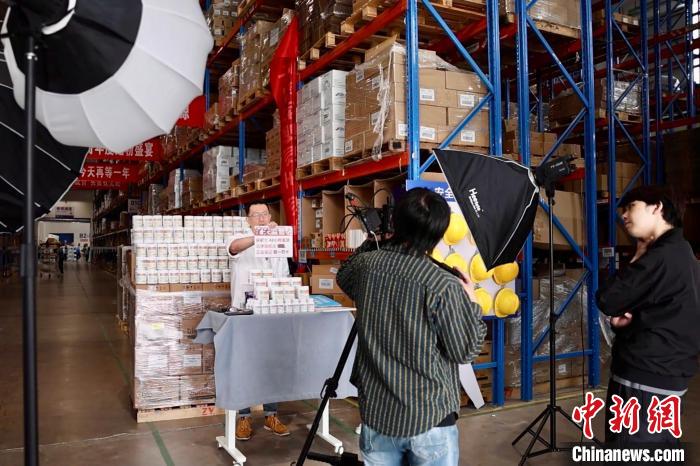 11月11日,浙江义乌保税物流中心处于“双十一”电商大促订单高峰,现场一片繁忙景象。义乌保税物流中心是浙江省继杭州、宁波以后的第三个B型保税物流中心,该中心产品来自全球60多个国家(地区)。图为电商主播在仓库直播带货。中新网