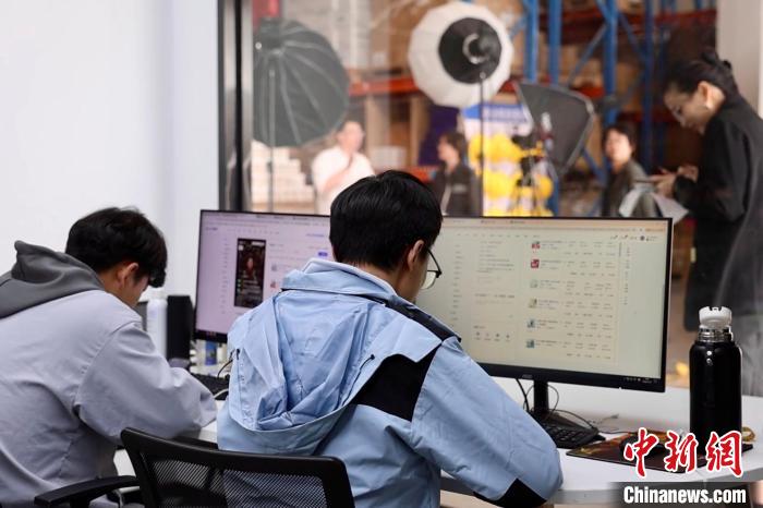 11月11日,浙江义乌保税物流中心处于“双十一”电商大促订单高峰,现场一片繁忙景象。义乌保税物流中心是浙江省继杭州、宁波以后的第三个B型保税物流中心,该中心产品来自全球60多个国家(地区)。图为电商主播在仓库直播带货,直播间的工作人员正在查看后台数据。中新网