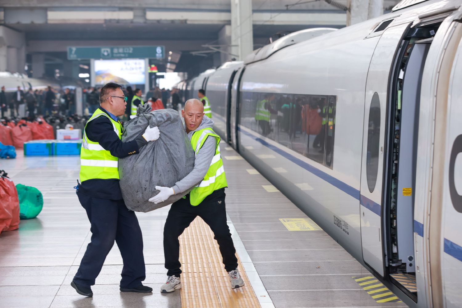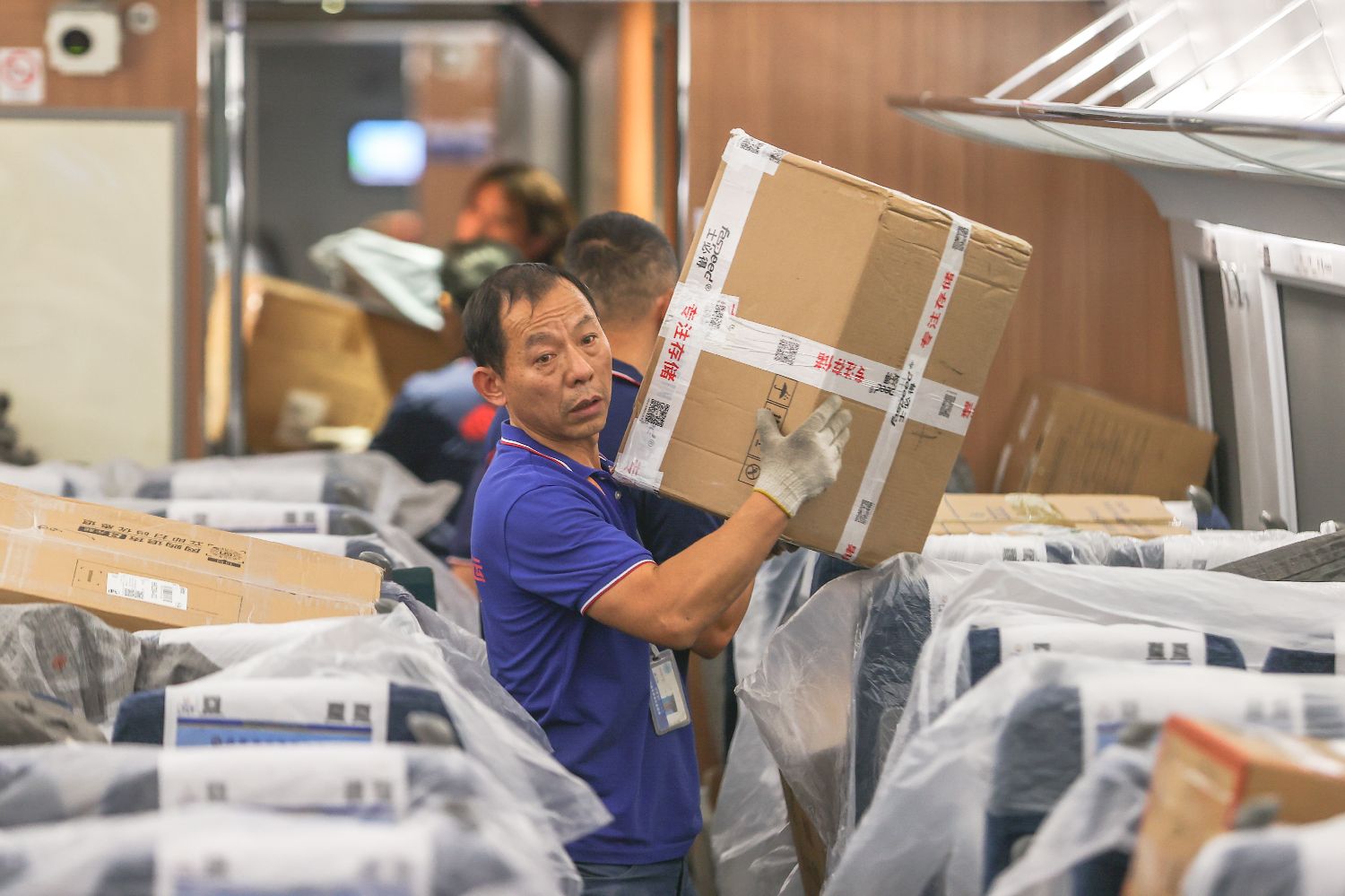 11月11日,南昌西站,中铁快运的工作人员把包裹货物搬运至高铁车厢内。当日为2024年“双十一”购物节,众多包裹货物被运至南昌西站准备搭乘高铁列车运往目的地。据悉,中国铁路南昌局集团有限公司于11月1日起启动为期20天的“双十一”网购高峰期铁路快运服务,利用列车车厢富余空间及高铁快运柜存放快件,预计发送货物达300余吨。中新社