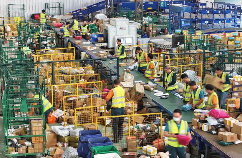 11月11日,在中国邮政集团有限公司湖南省永州市道县分公司邮件处理中心,工作人员在流水线上分拣快递包裹。新华社