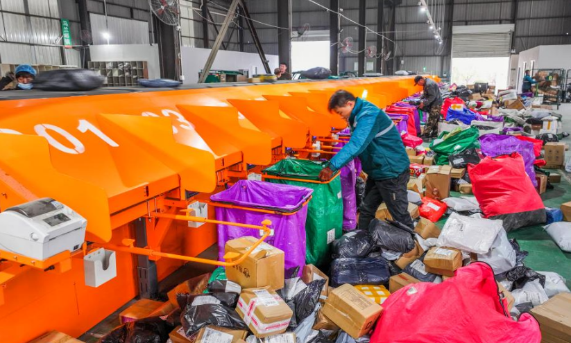 11月11日,工作人员在中国邮政集团有限公司河北省遵化市分公司物流中心分拣快递包裹。新华社
