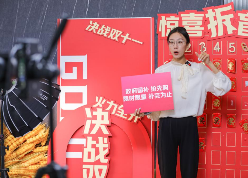 11月11日,主播在山东省青岛市李沧区深广互动直播基地内直播介绍家电“以旧换新”政策。新华社