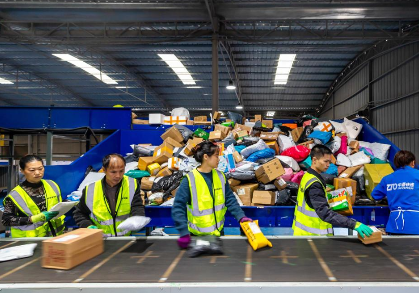11月11日,工作人员在贵州省黔西市双桥客运站快递物流中心分拣快递。新华社