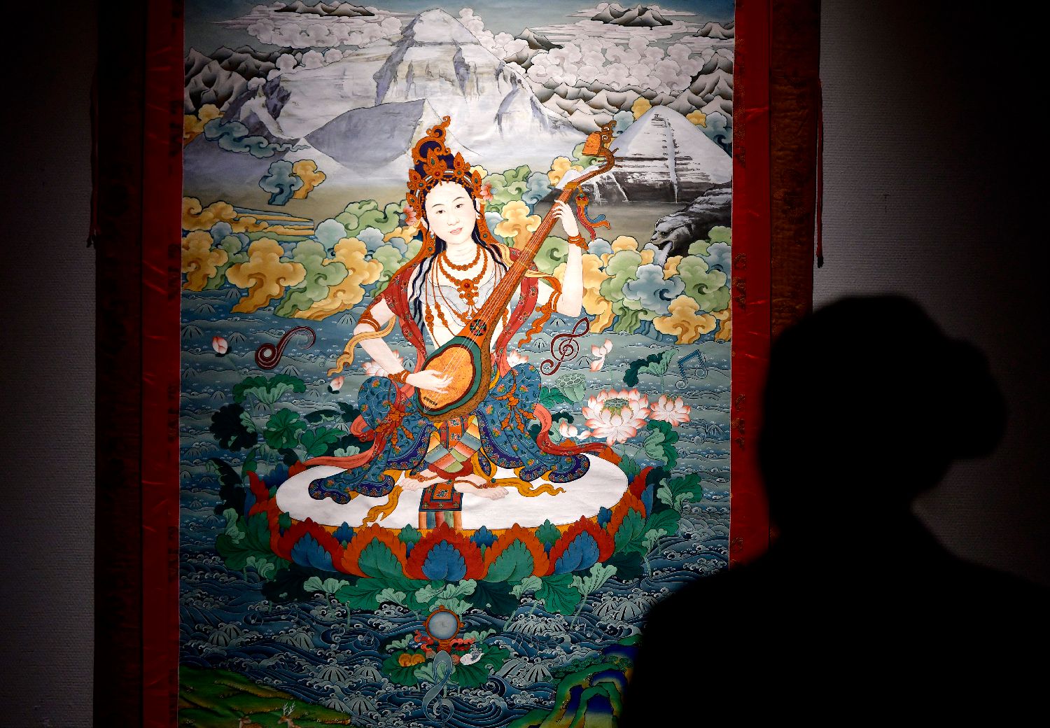11月12日,第十届“见即愿满”西藏精品唐卡展在拉萨市西藏美术馆开展。展览展出50余幅唐卡作品和20余幅当代布面重彩作品,展现西藏文化的深厚底蕴与现代审美的融合共生。图为观众欣赏展览中的唐卡作品。中新社