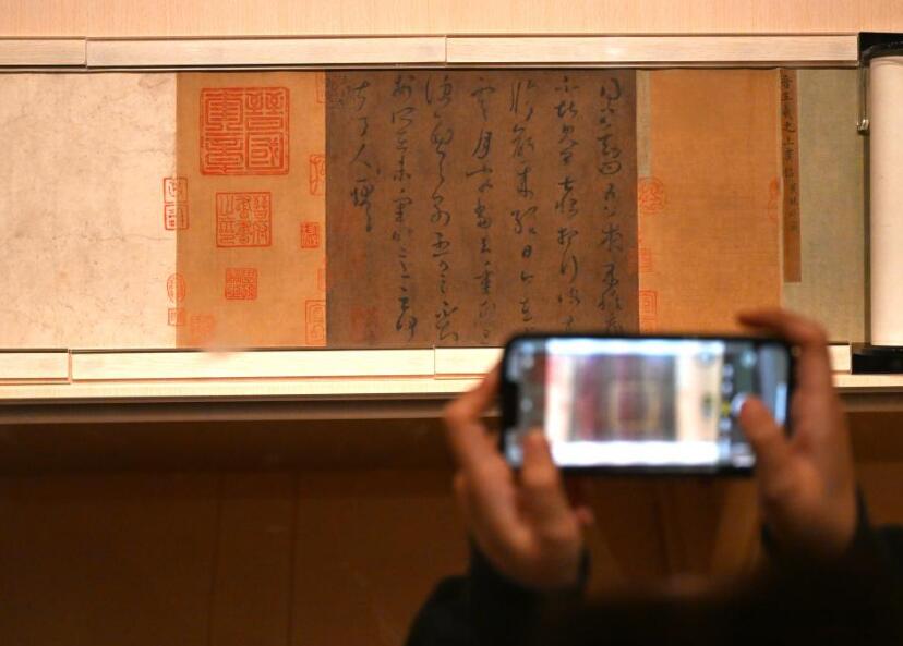 11月14日,观众在上海博物馆东馆中国历代书法馆拍摄东晋王羲之的《草书上虞帖卷》(局部)。