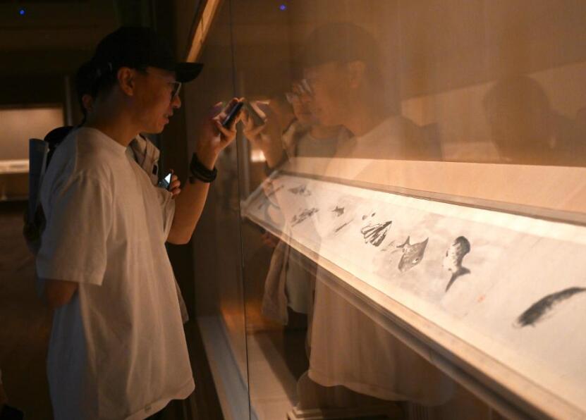 11月14日,观众在上海博物馆东馆中国历代绘画馆拍摄清代朱耷的《鱼鸭图卷》。